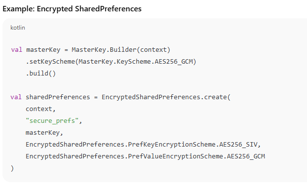 - Encrypt data using AES or EncryptedSharedPreferences: